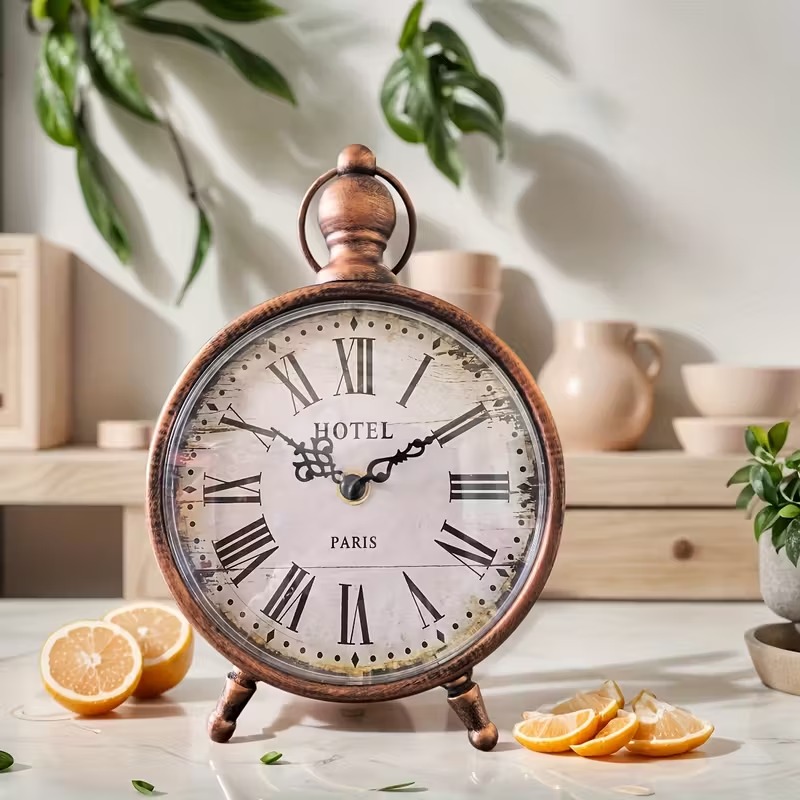 Bring timeless elegance into your space with this retro style desk clock. Crafted from durable metal, it combines a classic decorative design with silent operation, making it ideal for quiet environments. Perfect for use in the living room, office, study, or even as a stylish accent in cafés and kitchens. A versatile timepiece that blends functionality with aesthetic charm.
